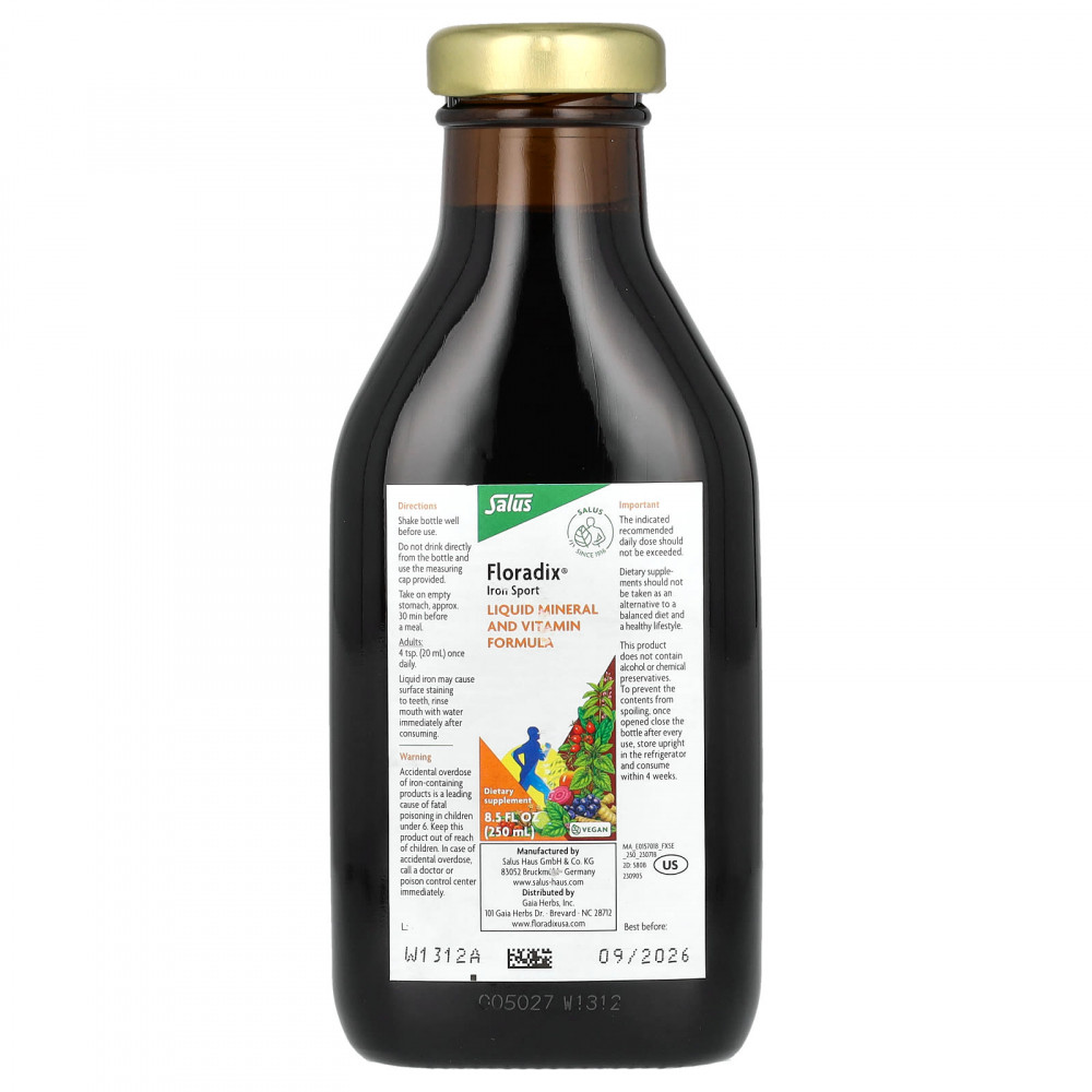 Floradix Iron Sport легко принимать, и он помогает поддерживать баланс железа и витаминов B1, B2, ниацина, B6, B12, C и D, магния, цинка и меди. Поскольку эти питательные вещества уже растворены, они быстрее усваиваются пищеварительной системой по сравнению с таблетками.