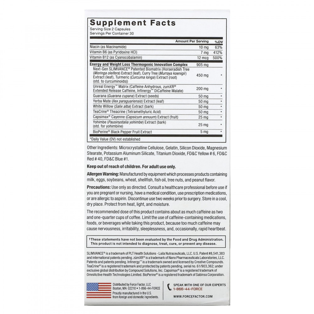 Что можно получить, если объединить энергетические соединения нового поколения с одним из самых значительных достижений в области снижения веса за последние 30 лет? результаты: В дополнение к SLIMVANCE®, обеспечивающему поистине революционные преимущества в снижении веса, эта инновационная формула включает 4 фирменных энергетических ингредиента, а также несколько термогенных соединений премиум-класса, которые помогают ускорить ваш метаболизм для впечатляющего сжигания жира. Кроме того, в состав впервые включена запатентованная матрица Unreal Energy™, специально разработанная для обеспечения устойчивого подъема энергии в течение дня, чтобы помочь вам полностью раскрыть свой потенциал (Unleash Your Potential®).
