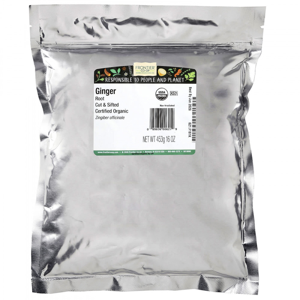 Нарезанный и просеянный корень органического имбиря Frontier Co-op® - это удобная форма специи, которая используется в кухнях всего мира благодаря своему теплому, пряно-сладкому вкусу и аромату. Этот имбирь очищают от кожуры и просеивают, не содержит сульфита, имеет сертификат органического и кошерного продукта.