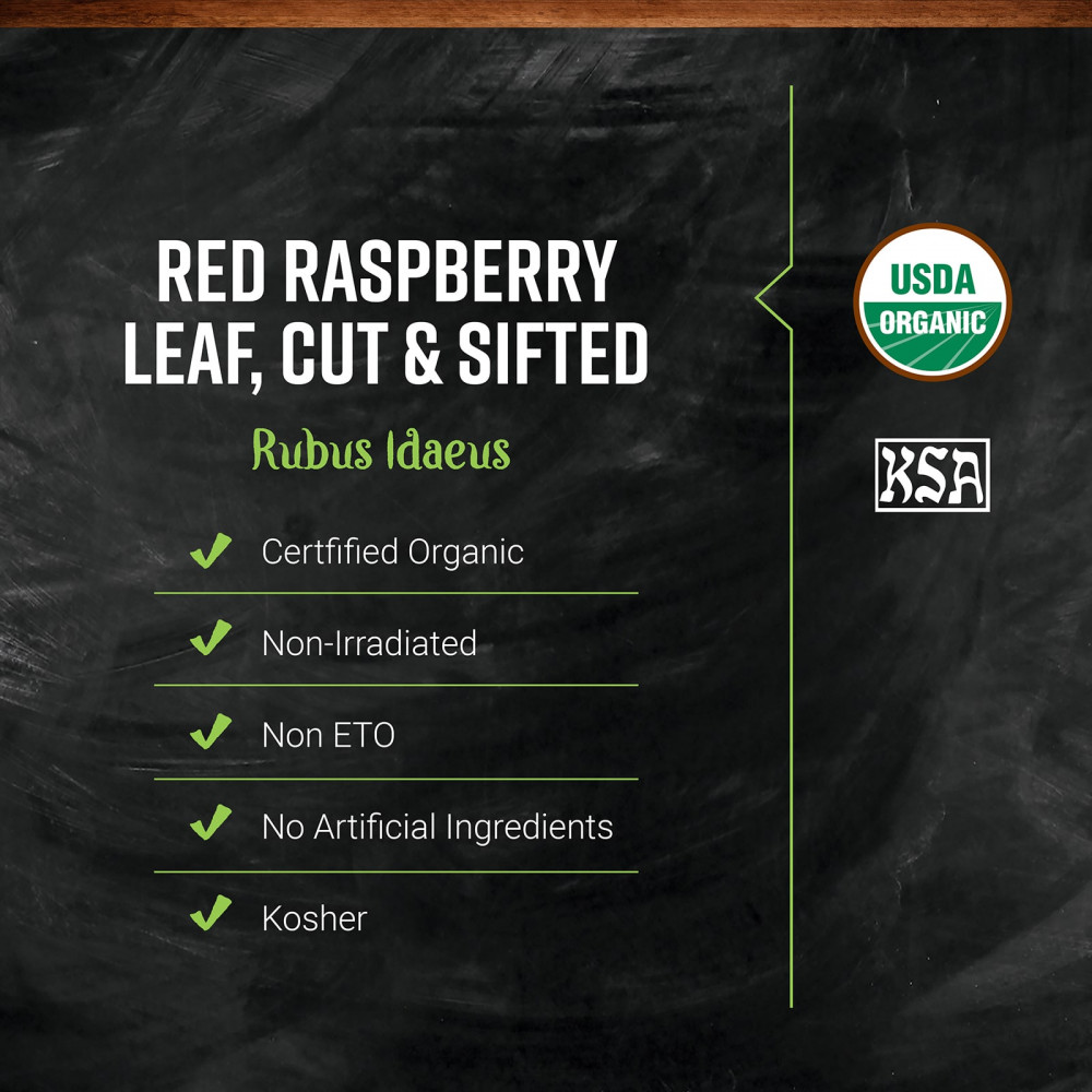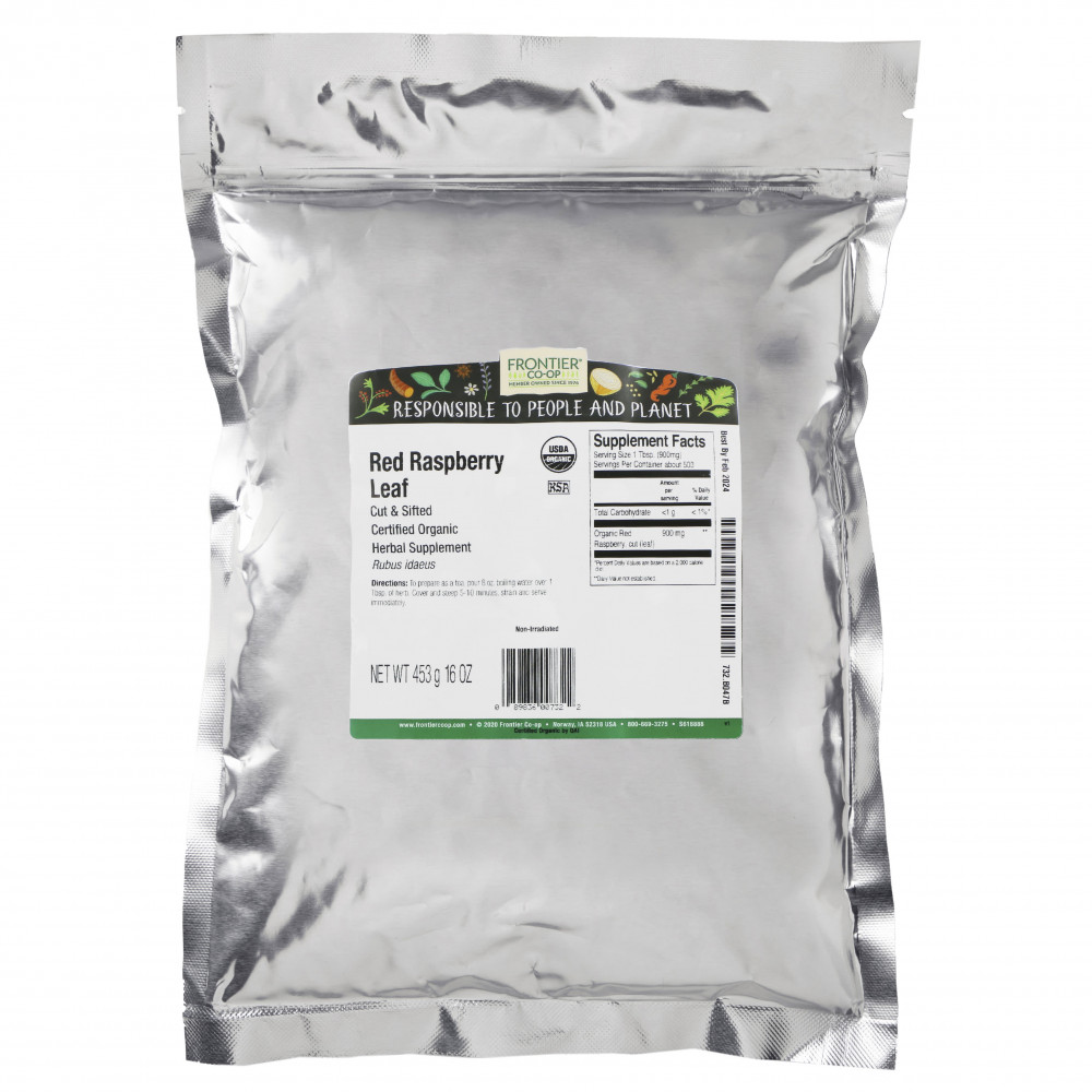 Листья органической красной малины Frontier Co-op используются для приготовления ароматного, терпкого чая и часто сочетаются с другими чайными травами, чтобы придать напиткам более насыщенный вкус. Листья красной малины также являются популярным ингредиентом в составе средств по уходу за телом, основанных на травах.