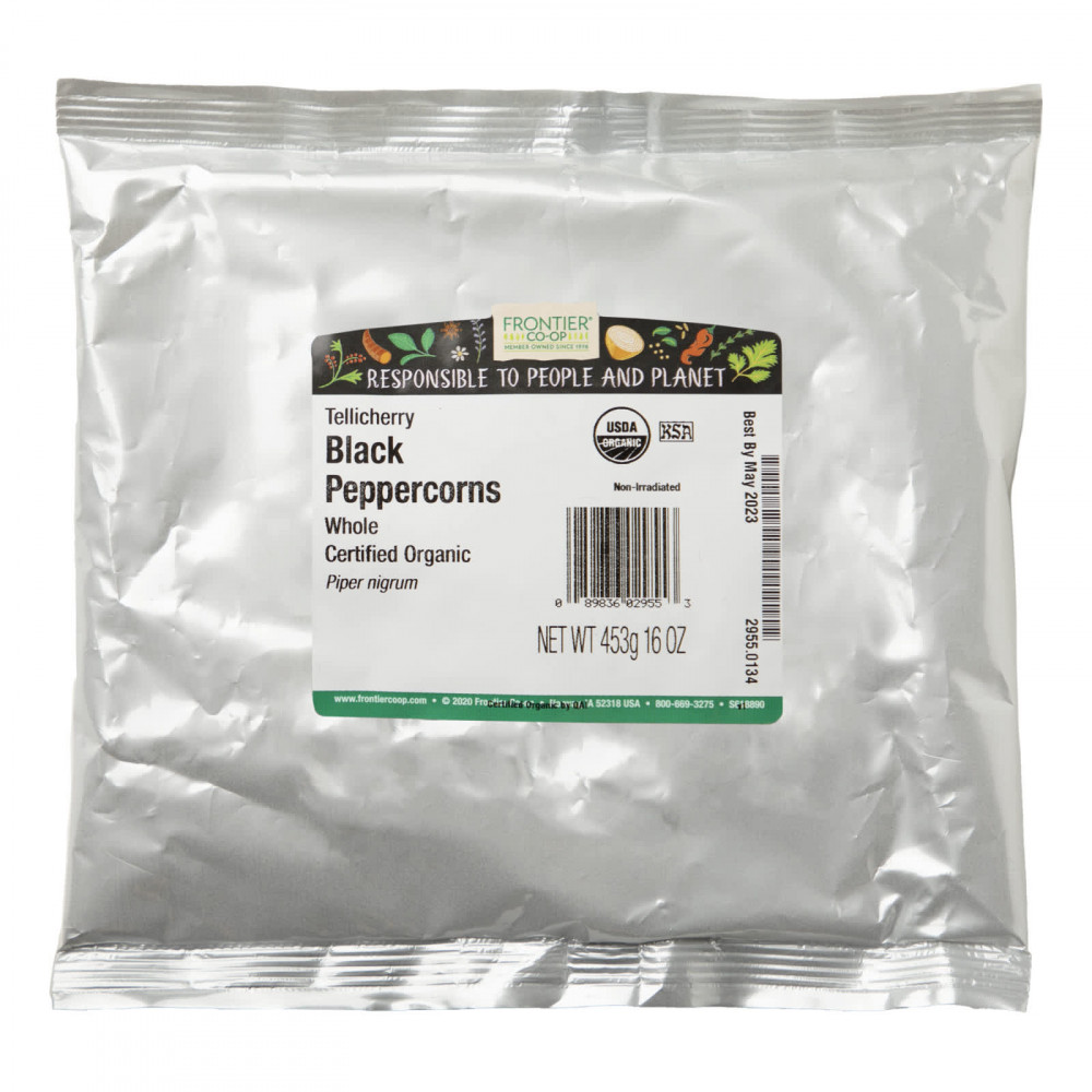 Черный перец горошком теличерри от Frontier Co-op Органический черный перец горошком (Piper nigrum) представляет собой высочайший сорт TGSEB, TGSEB. Горошины черного перца теличерри больше, чем обычный черный перец, и названы в честь Телличерри, города на Малабарском побережье в Северной Индии.