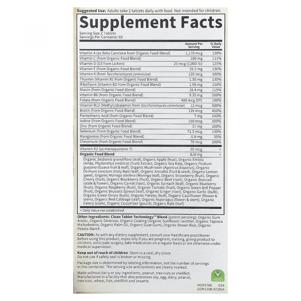 Мультивитамины из цельных пищевых продуктов — это сертифицированный органический комплекс из натуральных питательных пищевых ингредиентов, проверенный на отсутствие ГМО.