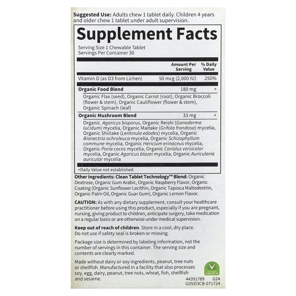 Жевательные таблетки с витамином D3 из цельных продуктов, сертифицированные как органические и не содержащие ГМО