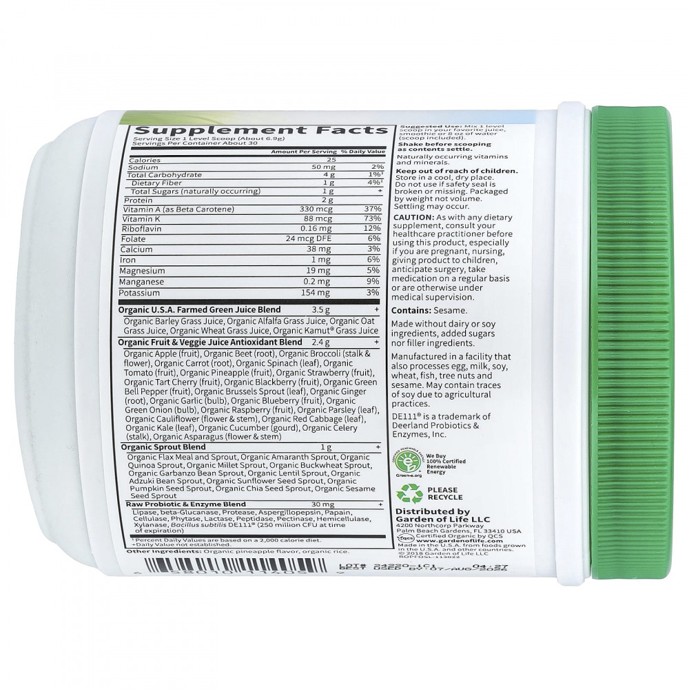 Raw Organic Perfect Food® содержит 40 богатых питательными веществами ингредиентов, включая свежесобранную зелень, высушенную при низкой температуре для сохранения питательных веществ, а также ростки, фрукты и овощи, а также живые пробиотики и ферменты для пищеварения.