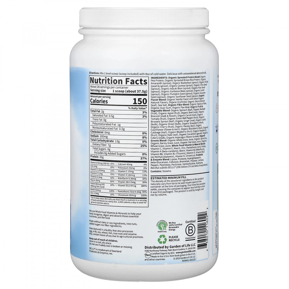 Органическая смесь пророщенных белков: органический гороховый белок, белок из органического проросшего бурого риса, органический амарант (ростки), органическая гречка (ростки), органическое просо (жемчужины и ростки), органическое киноа (ростки), органические семена чиа (ростки), органические ростки фасоли адзуки, органические семена льна (ростки), органические нут (ростки), органическая чечевица (ростки), органические семена тыквы (ростки), органические семена кунжута (ростки), органические семена подсолнечника (ростки), смесь органических ароматизаторов: органический ароматизатор "Ваниль" и другие органические натуральные ароматизаторы, органический эритритол, экстракт листьев органической стевии, морская соль, смесь органической клетчатки: органическая тапиоковая клетчатка, органическая гуаровая камедь, органическая льняная мука, смесь органических фруктов и овощей: органический шпинат (листья), органические плоды баобаба, органическое яблоко (плод), органическая свекла (корнеплод), органическая брокколи (стебли и цветки), органическая морковь (корнеплод), органический томат (плод), органический зеленый болгарский перец (плоды), листья органической брюссельской капусты, корень органического имбиря, органический чеснок (луковица), органический лук (луковица), органическая клубника (плод), плоды органической вишни, листья органической петрушки, органическая цветная капуста (цветки и стебли), органическая ежевика (плод), листья органической капусты, органическая голубика (плод), органическая малина (плоды), листья органической кудрявой капусты, органический огурец, стебель органического сельдерея, органическая спаржа (цветки и стебли), смесь органической зелени: сок органических ростков люцерны, органическая спирулина, сок органических ростков ячменя, сок органического овса, сок органических ростков пшеницы, смесь витаминов и минералов из цельных продуктов: витамин C, витамин E, ниацин, цинк, пантотеновая кислота, фолиевой кислоты, витамин А (бета-каротин), биотин, витамин B2 (рибофлавин), витамин B6, витамин B1 (тиамин), витамин D, витамин B12 (в виде метилкобаламина), витамин K, хрома, смесь пробиотиков и ферментов: липаза, протеаза, аспергиллопепсин, бета-глюканаза, целлюлаза, бромелайн, фитаза, лактаза, папаин, пептидаза, пектиназа, гемицеллюлаза, ксиланаза, сенная палочка (Bacillus subtilis) DE111® (250 млн КОЕ на момент истечения срока годности).