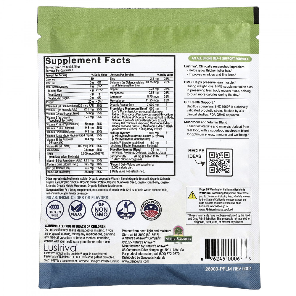 Изолят горохового протеина, смесь органических овощей и витаминов (органическая брокколи, органический шпинат, органическая кудрявая капуста, органическая тыква, органический батат, органические семена подсолнечника, органическая клюква, органическая хлорелла, органический гриб-баран, органический гриб шиитаке).