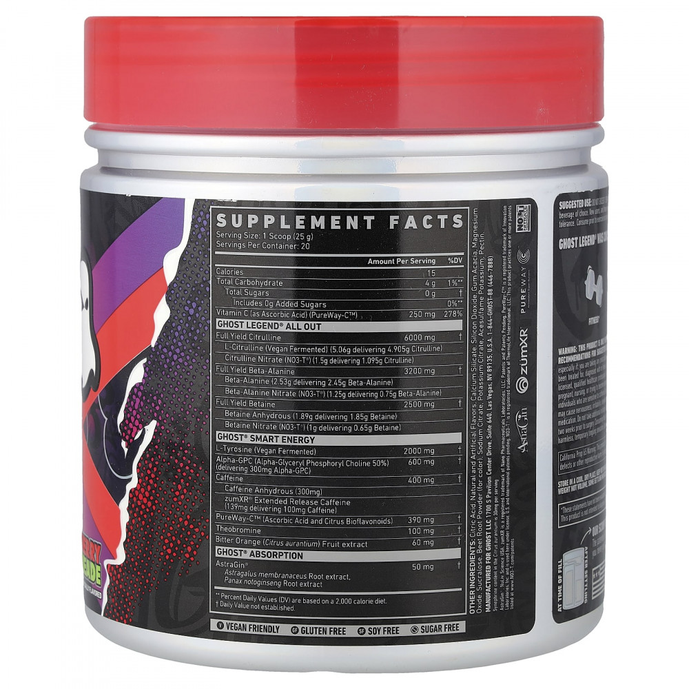 Не употреблять более 1 порции в день. Смешайте 1 мерную ложку (1 порцию) GHOST LEGEND® ALL OUT с 300–350 мл (10–12 унциями) воды или напитка по выбору. Лицам, которые принимают добавку впервые, а также людям, чувствительным к стимуляторам, следует начать с 1/2 порции (1/2 мерной ложки) для оценки личной переносимости. Принимать добавку необходимо перед тренировкой в дни тренировок.
