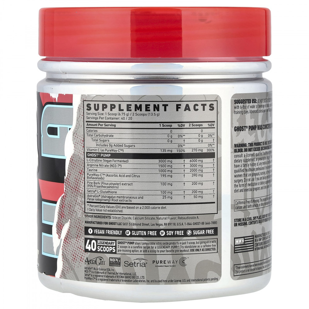 Не принимайте более 2 мерных ложек в день. Смешайте одну мерную ложку (1 порцию) GHOST® PUMP с 6–8 унциями воды или напитка по выбору, например GHOST LEGEND®, за 30 минут до тренировки в дни тренировок. Опытным пользователям / пользователям с массой тела более 160 фунтов: перед тренировкой смешайте 1–2 мерные ложки с 10–12 унциями воды.