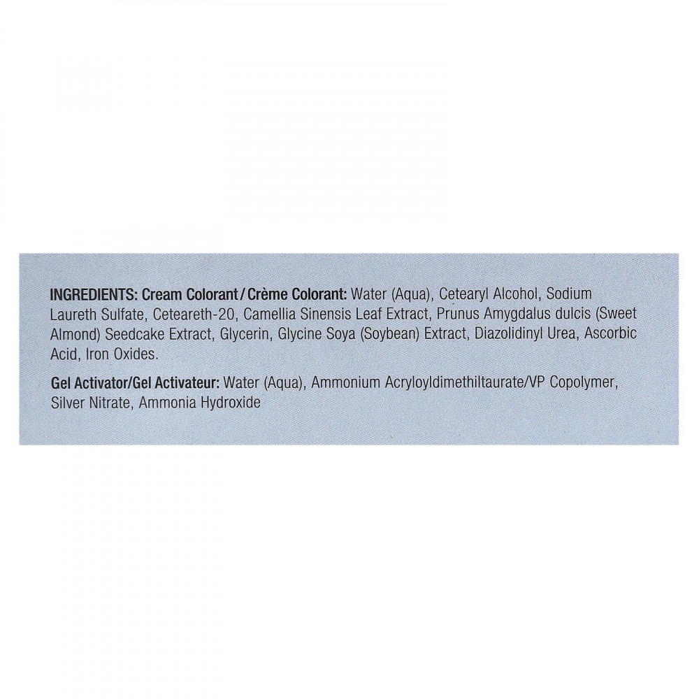 Крем-краситель: Вода, спирт, денат, Ядро акации катеховой / надземная часть ахиллеи (Aesculus hippocastanum) растение (virgaurea), листья крапивницы двудомной, плоды коровьей оспы (Vaccinium myrtillus), плоды витекса (Vitex agnus-castus), экстракт семян vitis vinifera, карбомер, гидроксид натрия. Может содержать пирогаллол.