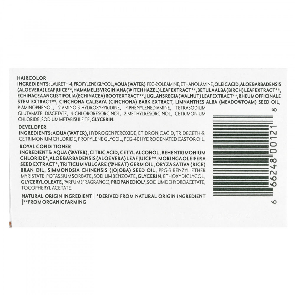 Ингредиенты краски для волос: лаурет-4, пропиленгликоль, вода, ПЭГ-2 олеамин, этаноламин, олеиновая кислота, сок листьев алоэ вера (Aloe barbadensis) **, экстракт листьев гамамелиса (Hamamelis virginiana) **, экстракт листьев березы (Betula alba) ** экстракт корня эхинацеи узколистной (Echinacea angustifolia), экстракт листьев грецкого ореха (Juglans regia) **, экстракт стеблей Rheum officinale **, экстракт коры хинного дерева (Cinchona calisaya), масло из семян пенника лугового (Limnanthes alba), п-аминофенол, 2-амино-3-гидроксипиридин, п-фенилендиамин, диацетат глутамата тетранатрия, 4-хлорорезорцин, 2-метилрезорцин, цетримония 00 хлорид, метабисульфит натрия, глицерин.