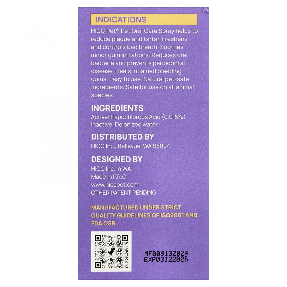 Спрей для ухода за полостью рта HICC Pet® помогает уменьшить зубной налет и зубной камень. Освежает и контролирует неприятный запах изо рта. Успокаивает незначительное раздражение десен. Снижает уровень бактерий в полости рта и предотвращает заболевания пардонта. Заживляет воспаленные, кровоточащие десны. Простое использование. Натуральные ингредиенты, безопасные для животных. Безопасен для всех видов животных.