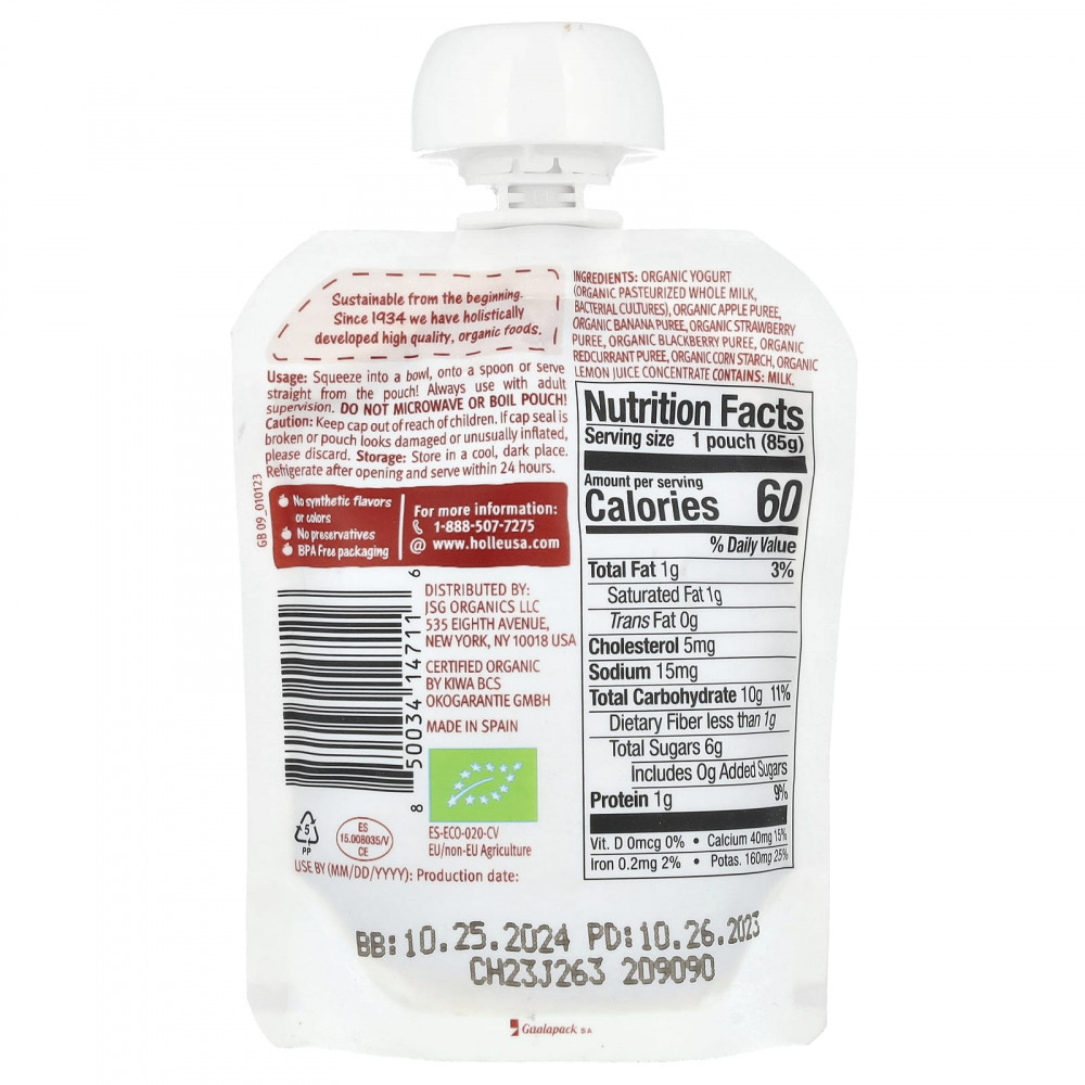 Органический йогурт (органическое пастеризованное цельное молоко, бактериальные культуры), органическое яблочное пюре, органическое банановое пюре, органическое клубничное пюре, пюре из органической ежевики, органическое пюре из красной смородины, органический кукурузный крахмал, органический концентрат лимонного сока.
