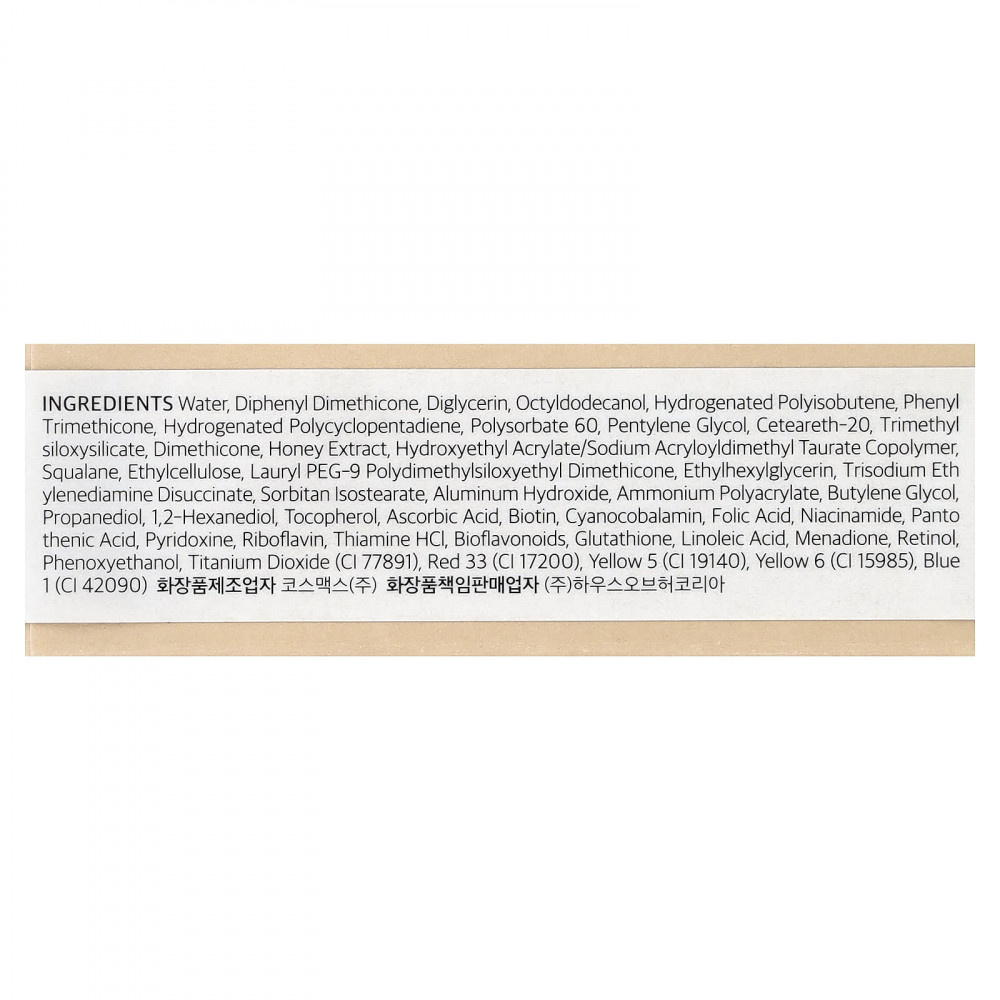 Вода, дифенил диметикон, диглицерин, октилдодеканол, гидрогенизированный полиизобутен, фенилтриметикон, гидрогенизированный полициклопентадиен, полисорбат 60, пентилен гликоль, цетеарет-20, триметил силоксисиликат, диметикон, экстракт меда, гидроксиэтил акрилат/натрия акрилоилдиметилтаурата сополимер, сквалан, этилцеллюлоза, лаурил ПЭГ-9 полидетилсилоксиэтил диметикон, этилгексилглицерин, тринатрия этилендиамин дисукцинат, сорбитан изостеарат, гидроксид алюминия, полиакрилат аммония, бутиленгликоль, пропандиол, 1,2-гександиол, токоферол, аскорбиновая кислота, биотин, цианокобаламин, фолиевая кислота, никотинамид, пантотеновая кислота, пиридоксин, рибофлавин, тиамина гидрохлорид, биофлавоноиды, глутатион, линолевая кислота, менадион, ретинол, феноксиэтанол, диоксид титана (CI 77891), краситель красный 33 (CI 17200), краситель жёлтый 5 (CI 19140), краситель желтый 6 (CI 15985), краситель синий 1 (CI 42090).