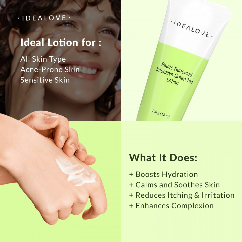 Интенсивный лосьон с зеленым чаем Peace Renewed от Idealove® бережно успокаивает и увлажняет вашу кожу. Этот легкий и быстро впитывающийся лосьон, насыщенный экстрактом зеленого чая, успокаивающей готу колой, увлажняющими гиалуронатом натрия и ласточкиным гнездом, придает коже чистый и здоровый вид. Ингредиенты премиального качества обладают описанными ниже полезными свойствами.