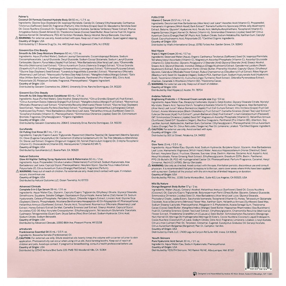 Тоник Pixi Glow: Вода, гликолевая кислота, гидроксид натрия, бутиленгликоль, глицерин, сок из листьев алоэ вера (Aloe barbadensis), вода из гамамелиса (Hamamelis virginiana), экстракт семян конского каштана (Aesculus hippocastanum), гексиленгликоль, фруктоза, глюкоза, сахароза, мочевина, декстрин, аланин, глутаминовая кислота, аспарагиновая кислота, гексил никотинат, экстракт корня женьшеня (Panax ginseng), этилгексилглицерин, двунатриевая ЭДТК, биотин, пантенол, ППГ-26-бутет-26, ПЭГ-40 гидрогенизированное касторовое масло, феноксиэтанол, парфюмерная композиция/отдушка, карамель, гексил циннамал, краситель красный 4 (CI 14700), бензилбензоат.