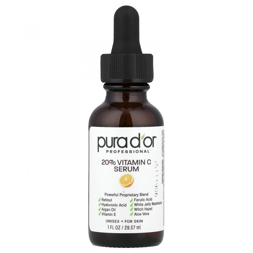 Сыворотка PURA D'OR с витамином C: Обесцвеченный сок листьев алоэ вера (Aloe barbadensis)*, аскорбиновая кислота (витамин C), пропандиол, экстракт коры гамамелиса (Hamamelis virginiana)*, экстракт белого снежного гриба (Tremella fuciformis), бетаин, глицерин*, гиалуроновая кислота, феруловая кислота, метилсульфонилметан, токоферол (витамин E), аргановое масло (Argania spinosa), ретинол (витамин A), масло семян жожоба (Simmondsia chinensis)*, масло из цедры апельсина (Citrus aurantium dulcis)*, фитиновая кислота, цитрат натрия, метабисульфит натрия, ксантановая камедь, каприлилгликоль, каприлгидроксаминовая кислота, полисорбат 20.