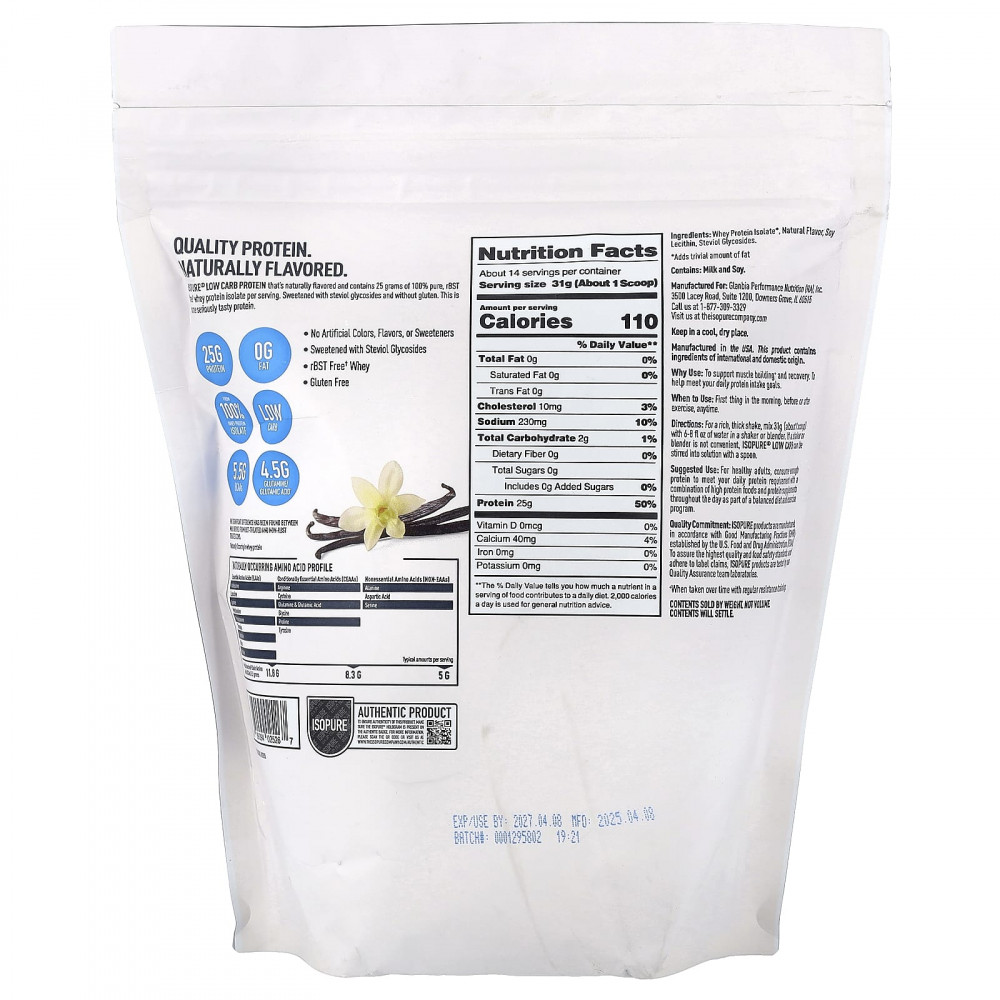 Низкоуглеводный протеин Isopure® с натуральным ароматизатором содержит 25 г 100% чистого изолята сывороточного протеина без р-БСТ† в 1 порции. Подслащено стевиолгликозидами и не содержит глютена. Это действительно вкусный протеин.