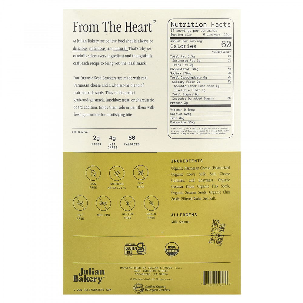 Органический сыр пармезан (пастеризованное органическое коровье молоко, соль, сырные культуры, и ферменты), органическая мука из кассавы, органические семена льна, органические семена кунжута, органические семена чиа, очищенная вода, морская соль.