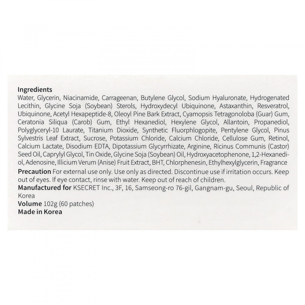 Вода, глицерин, никотинамид, каррагинан, бутиленгликоль, гиалуронат натрия, гидрогенизированный лецитин, стеролы сои (Glycine soja), гидроксидецил убихинон, астаксантин, ресвератрол, убихинон, ацетил гексапептид-8, олеоил экстракт сосновой коры, гуаровая камедь (Cyamopsis tetragonoloba), камедь рожкового дерева (Ceratonia siliqua), этил гександиол, гексиленгликоль, аллантоин, пропандиол, полиглицерил-10 лаурат, диоксид титана, синтетический фторфлогопит, пентилен гликоль, экстракт хвои сосны (Pinus sylvestris), сахароза, хлорид калия, хлорид кальция, целлюлозная камедь, ретинол, лактат кальция, двунатриевая ЭДТК, дикалия глицирризат, аргинин, касторовое масло (Ricinus communis), каприлилгликоль, оксид олова, соевое масло (Glycine soja), гидроксиацетофенон, 1,2-гександиол, аденозин, экстракт плодов аниса звездчатого (Illicium verum), бутилгидрокситолуол, хлорфенезин, этилгексилглицерин, отдушка.