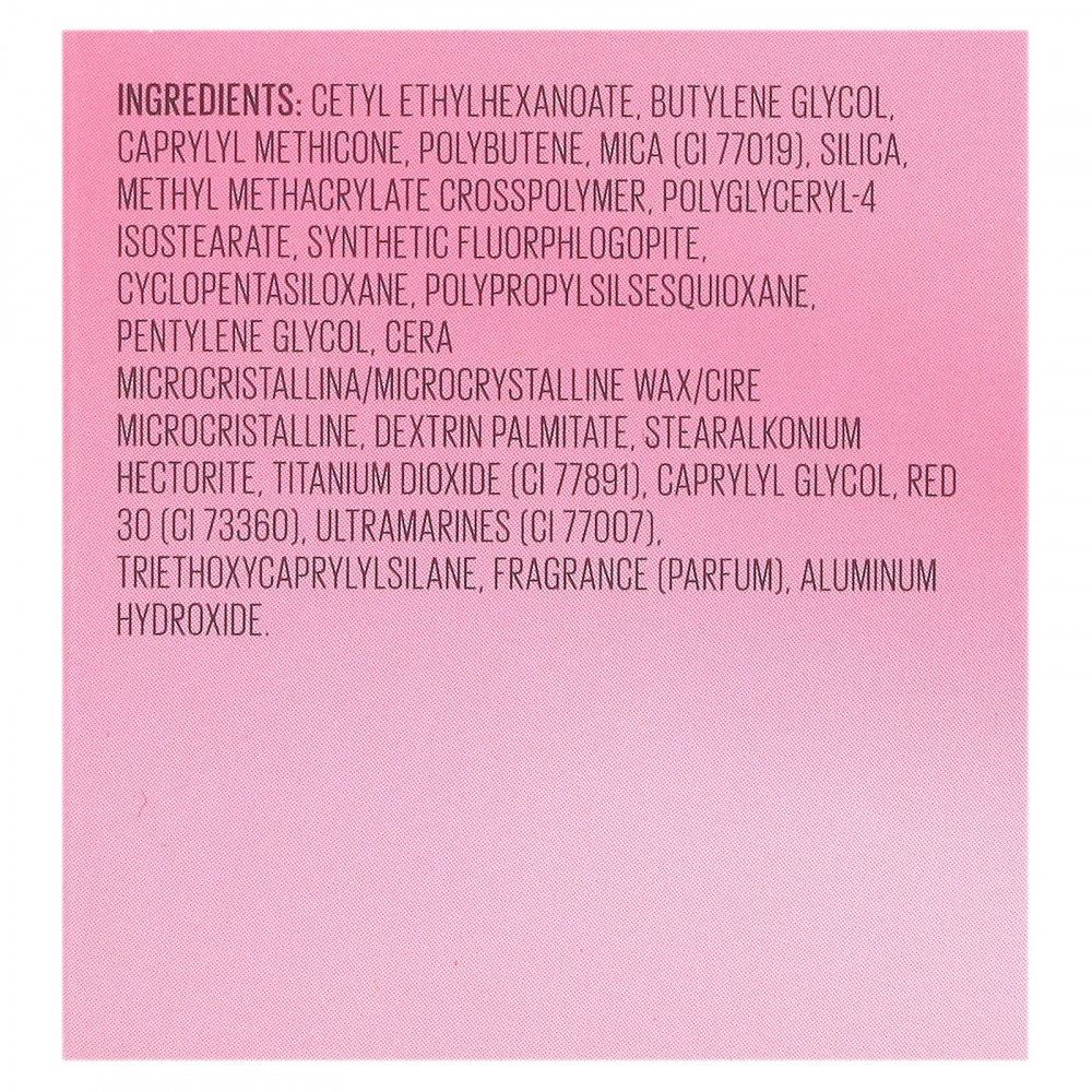 Цетил этилгексаноат, бутиленгликоль, каприлил метикон, полибутен, слюда (CI 77019), диоксид кремния, метил метакрилат кроссполимер, полиглицерил-4 изостеарат, синтетический фторфлагопит. циклопентасилоксан, полипропилсилсесквиоксан, пентилен гликоль, микрокристаллический воск (Cera microcristallina), декстрин пальмитат, стеаралкония гекторит, диоксид титана (CI 77891), каприлилгликоль, краситель красный 30 (CI 73360), ультрамарины (CI 77007). триэтоксикаприлилсилан, отдушка (парфюмерная композиция), гидроксид алюминия.