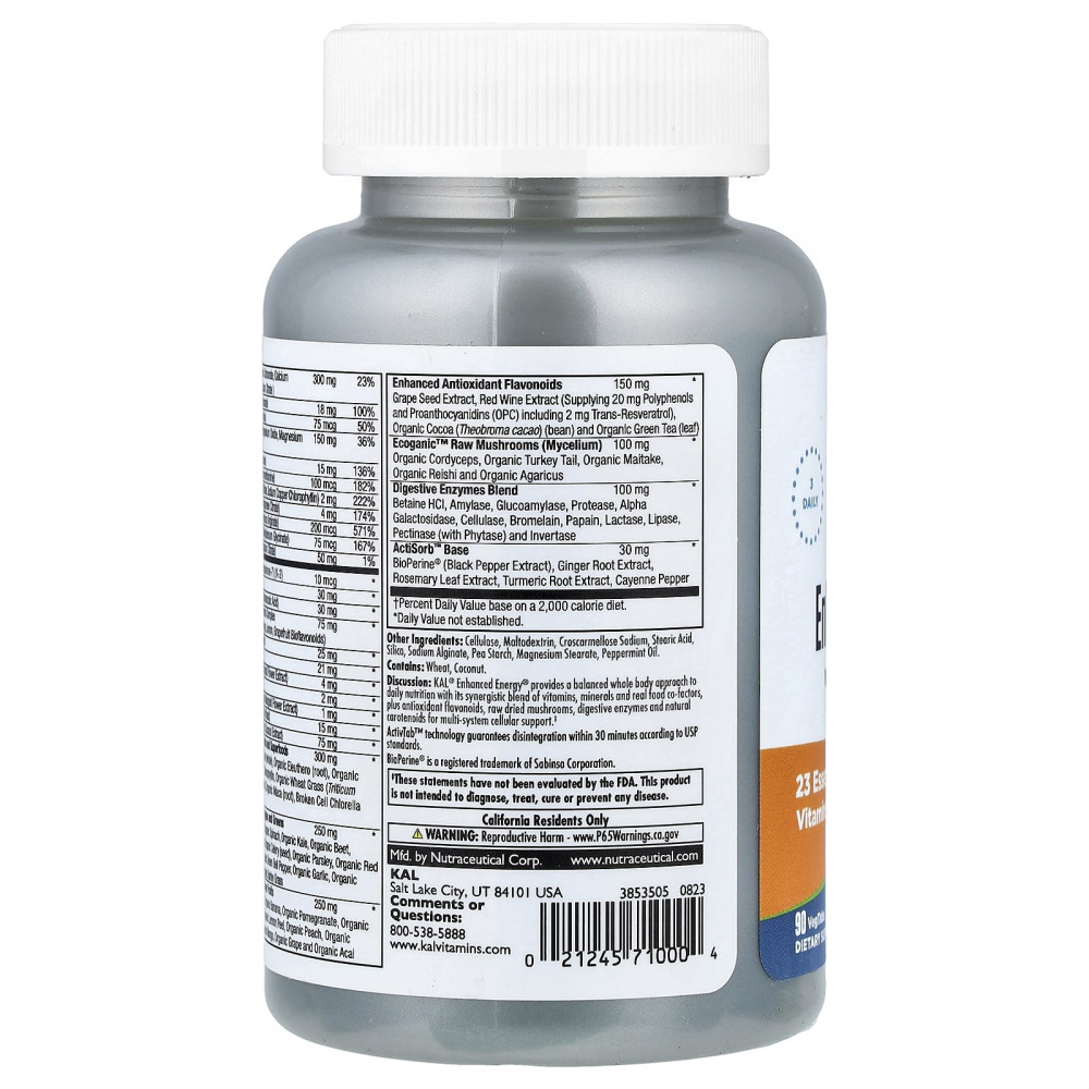Описание. KAL® Enhanced Energy® обеспечивает сбалансированный подход к ежедневному питанию для всего организма благодаря синергетической смеси витаминов, минералов и кофакторов натуральных продуктов, а также антиоксидантные флавоноиды, сушеные грибы, пищеварительные ферменты и натуральные каротиноиды для комплексной поддержки клеток.