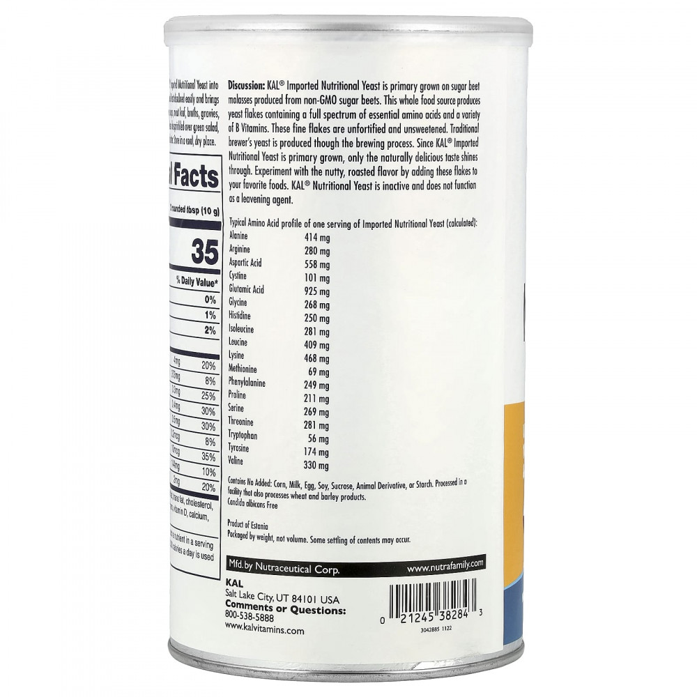 Импортные пищевые дрожжи KAL® в основном выращиваются на патоке сахарной свеклы, полученной из сахарной свеклы без ГМО. Этот цельный источник пищи производит дрожжи в хлопьях, содержащие полный спектр незаменимых аминокислот и различные витамины группы B. Эти мелкие хлопья не содержат витаминов и подсластителей. Традиционные пивные дрожжи производятся в процессе пивоварения. Поскольку импортные пищевые дрожжи KAL® выращиваются в качестве основного продукта, они имеют только натуральный восхитительный вкус. Поэкспериментируйте с ореховым обжаренным вкусом, добавив эти хлопья в свои любимые блюда. Пищевые дрожжи KAL® неактивны и не действуют как разрыхлитель.