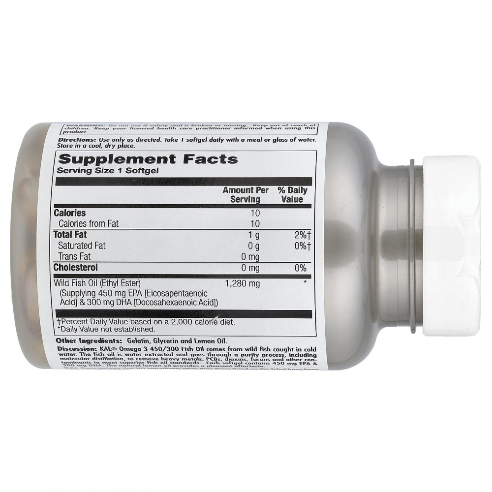 Описание. Рыбий жир KAL® Omega 3 450/300 получают из дикой рыбы, пойманной в холодной воде. Рыбий жир извлекается из воды и проходит процесс очистки, включая молекулярную дистилляцию, для удаления тяжелых металлов, ПХД, диоксинов, фуранов и других загрязняющих веществ в соответствии с высочайшими стандартами рыбьего жира. Каждая капсула содержит 450 мг ЭПК и 300 мг ДГК. Натуральное масло лимона обеспечивает приятное послевкусие.