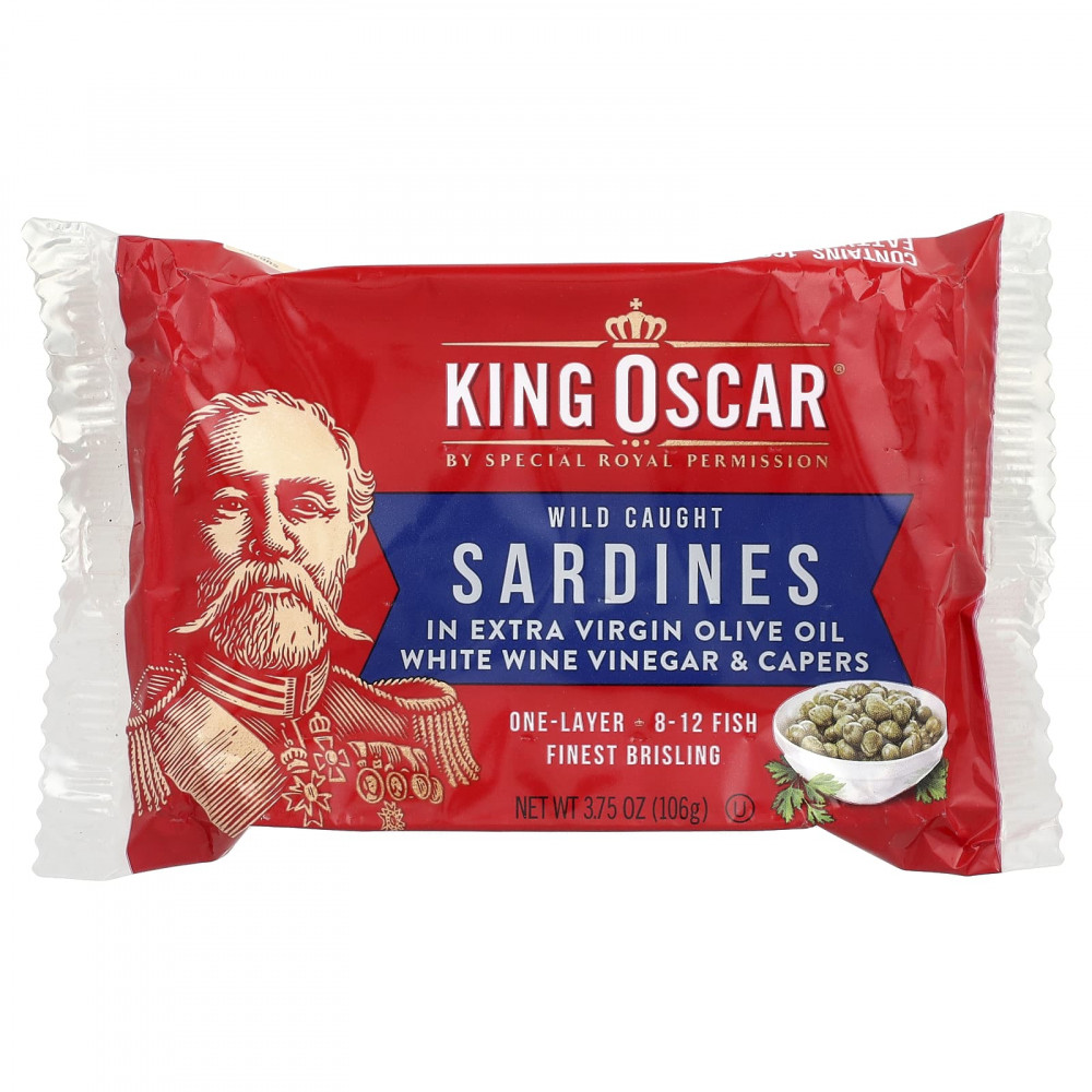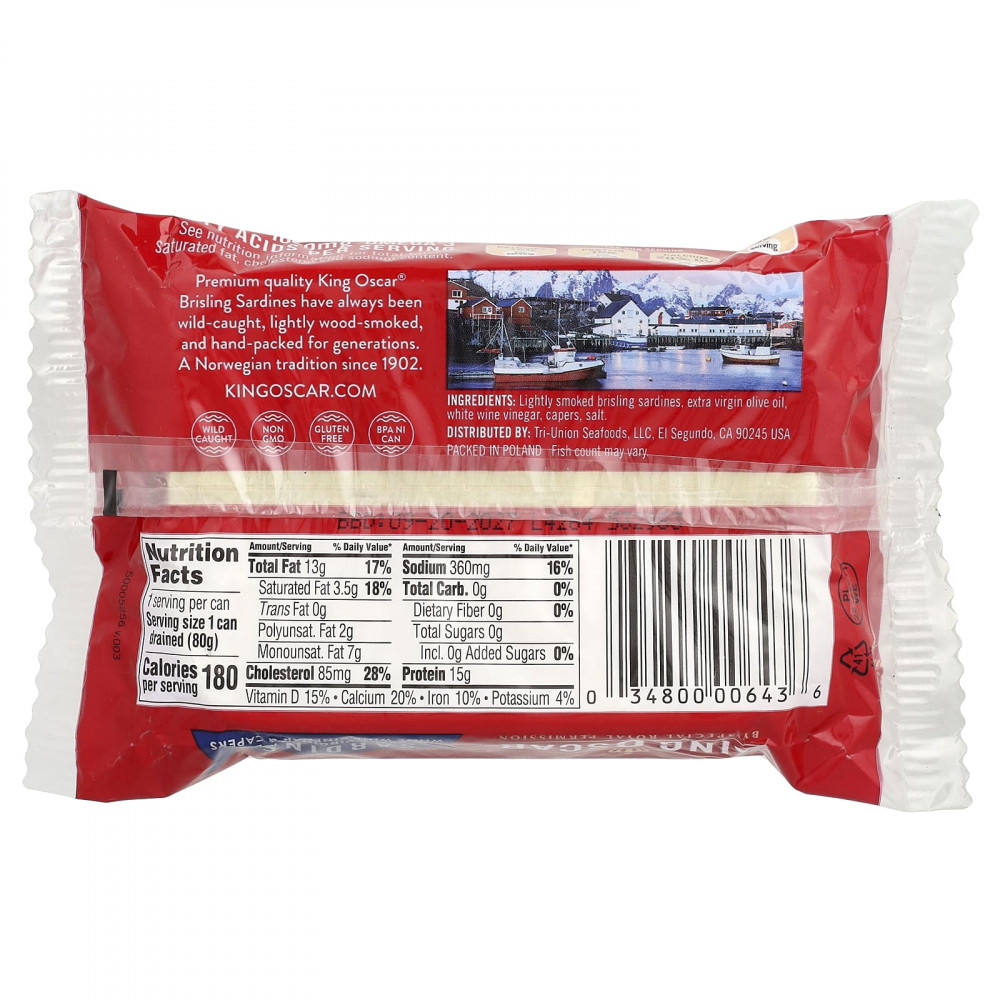 Сардины King Oscar® Brisling Sardines премиального качества всегда производятся из дикого улова, слегка копченые на дровах, и упаковываются вручную на протяжении поколений. Норвежская традиция с 1902 года.