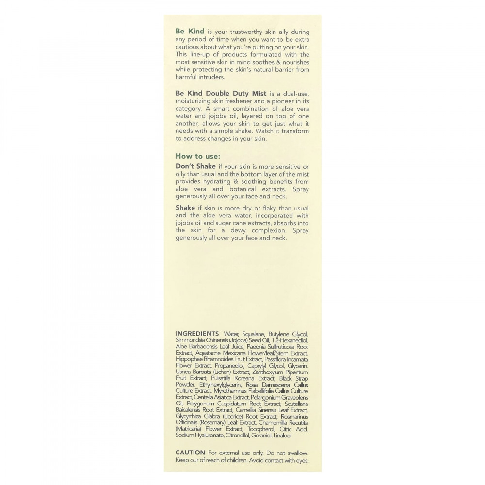 Спрей Be Kind Double Duty — это увлажняющий освежитель двойного действия в своей категории. Умное сочетание воды алоэ вера и масла жожоба, наносимых друг на друга, позволяет вашей коже получить все, что ей нужно, одним легким коктейлем. Посмотрите, как он преобразовывается в соответствии с изменениями в вашей коже.