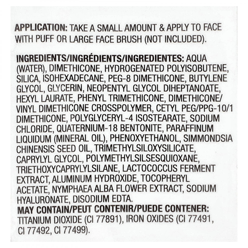 Вода (Aqua), диметикон, гидрогенизированный полиизобутен, диоксид кремния, изогексадекан, ПЭГ-8 диметикон, бутиленгликоль, глицерин, неопентилгликоль дигептаноат, гексил лаурат, фенилтриметикон, диметикон/винил диметикон кроссполимер, цетил ПЭГ/ППГ-10/1 диметикон, полиглицерил-4 изостеарат, хлорид натрия, кватерний-18 бентонит, вазелиновое (минеральное) масло, феноксиэтанол, масло семян жожоба (Simmondsia chinensis), триметилсилоксисиликат, каприлилгликоль, полиметилсилсесквиоксан, триэтоксикаприлилсилан, экстракт продукта ферментации лактококка, гидроксид алюминия, токоферилацетат, экстракт цветков кувшинки белой (Nymphaea alba), гиалуронат натрия, двунатриевая ЭДТК. Может содержать диоксид титана (CI 77891), оксиды железа (CI 77491, CI 77492, CI 77499).