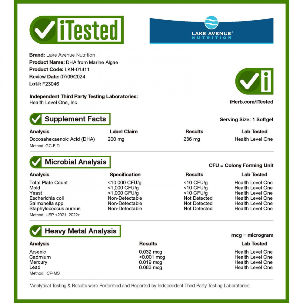 ДГК из морских водорослей от Lake Avenue® Nutritionсодержит докозагексаеновую кислоту (ДГК) из водорослевого масла.