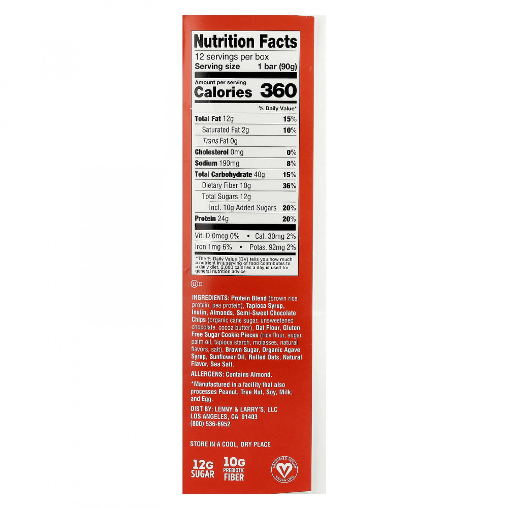 Смесь протеинов (протеин из бурого риса, гороховый протеин), тапиоковый сироп, инулин, миндаль, полусладкие шоколадные крошки (органический тростниковый сахар, горький шоколад, какао-масло), овсяная мука, кусочки сахарного печенья без глютена (рисовая мука, сахар, пальмовое масло, тапиоковый крахмал, патока, натуральные ароматизаторы, соль), коричневый сахар, сироп из органической агавы, подсолнечное масло, плющеная овсянка, натуральный ароматизатор, морская соль.