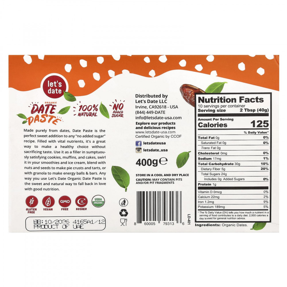 Финиковая паста, изготовленная исключительно из фиников, является идеальным сладким дополнением к любому рецепту без добавления сахара. Наполненный жизненно важными питательными веществами, это отличный способ сделать выбор в пользу здорового питания, не жертвуя вкусом. Любой способ использования органической финиковой пасты Let's Date - это сладкий и естественный способ снова полюбить хорошее питание.