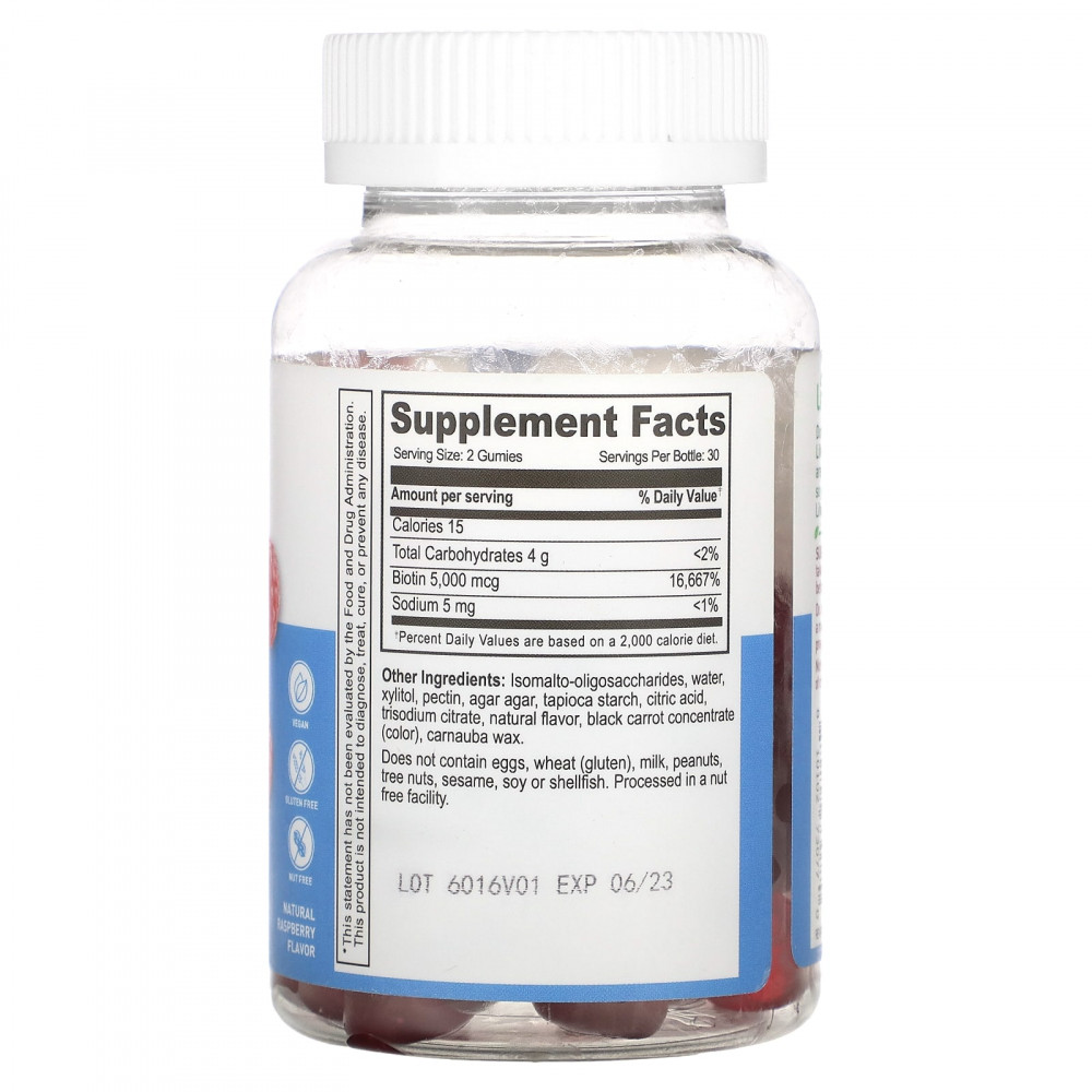 Каждая порция этих жевательных таблеток с восхитительным малиновым вкусом содержит 5000 мкг биотина, водорастворимого витамина группы B, который, как показывают исследования, важен для поддержания здоровья волос, кожи и ногтей.