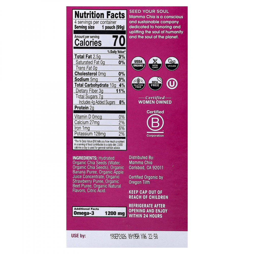 Гидрогенизированные органические семена чиа (вода, органические семена чиа), органическое банановое пюре, концентрат органического яблочного сока, органическое клубничное пюре, пюре из органической свеклы, органические натуральные ароматизаторы, лимонная кислота.