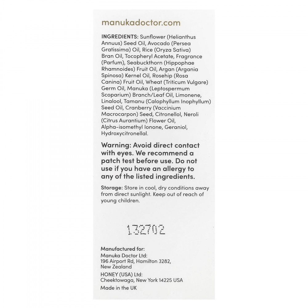 Масло семян подсолнечника (Helianthus annuus), масло авокадо (Persea gratissima), масло из рисовых отрубей (Oryza sativa), токоферилацетат, отдушка (парфюмерная композиция), масло из плодов облепихи (Hippophae rhamnoides), аргановое масло (Argania spinosa), масло шиповника (Rosa canina), масло зародышей пшеницы (Triticum vulgare), масло из веток/листьев манука (Leptospermum scoparium), лимонен, линалоол, масло из семян таману (Calophyllum inophyllum), семена клюквы (Vaccinium macrocarpon), цитронеллола, масло из цветков нероли (Citrus aurantium), альфа-изометилионон, гераниола, гидроксицитронеллаль.