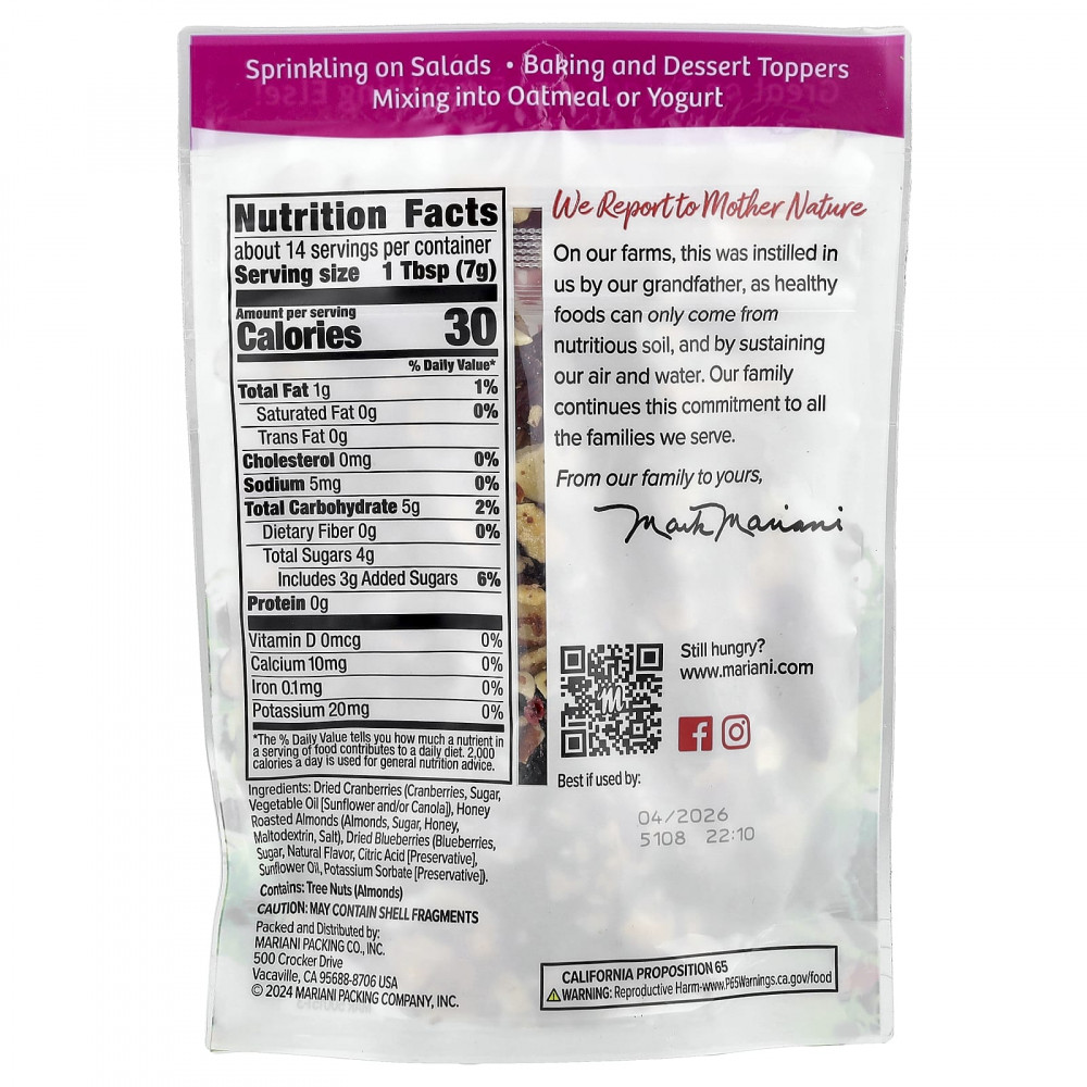 Сушеная клюква (клюква, сахар, растительное масло [подсолнечное и/или рапсовое]), обжаренный миндаль с медом (миндаль, сахар, мёд, мальтодекстрин, соль), сушеная голубика (голубика, сахар, натуральный ароматизатор, лимонная кислота [консерванты], подсолнечное масло, сорбат калия [консервант]).