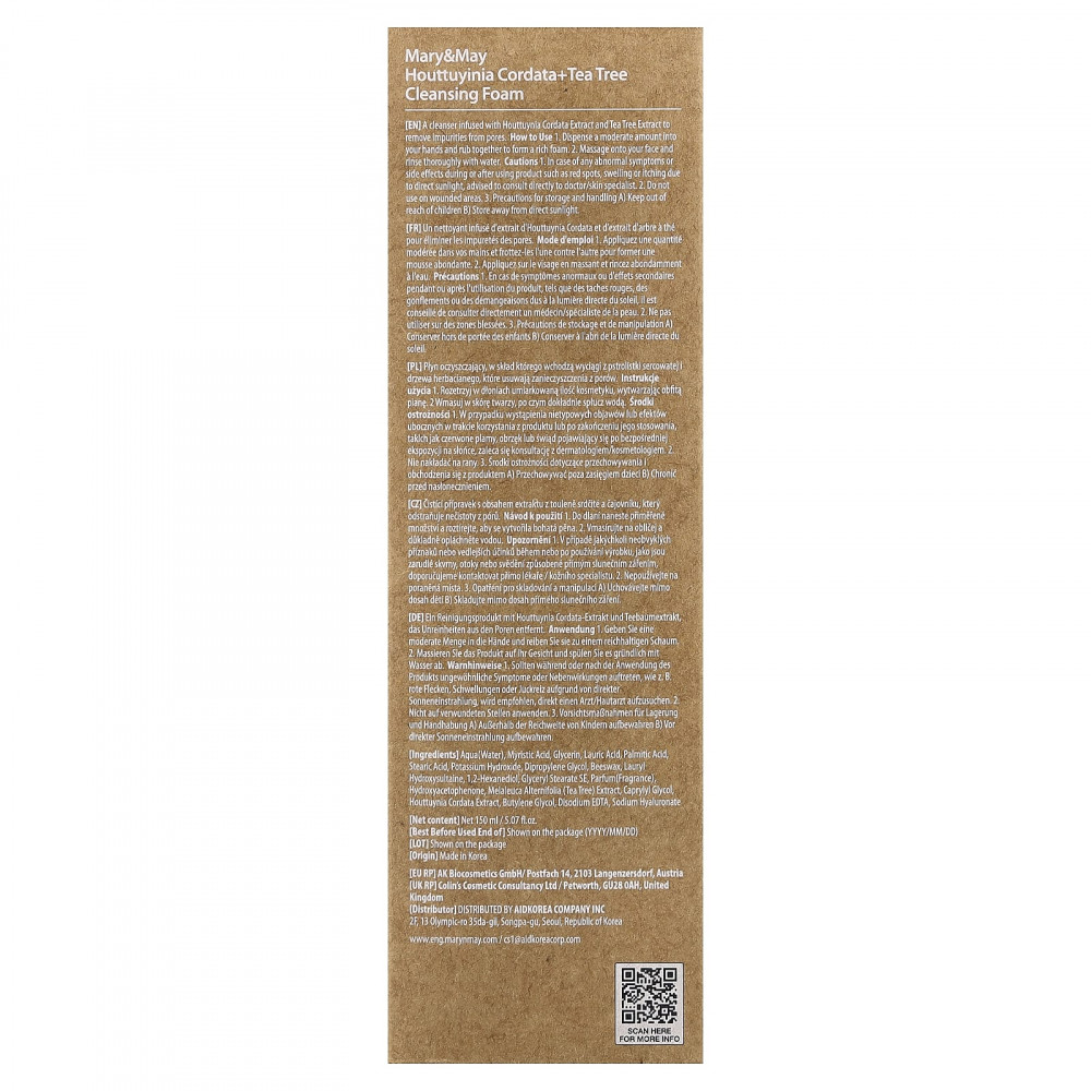 Вода, миристиновая кислота, глицерин, Лауриновая кислота, пальмитиновая кислота, стеариновая кислота, едкое кали, дипропиленгликоль, воск, лаурил гидроксисултаин, 1,2-гександиол, глицерилстеарат SE, отдушка (отдушка) гидроксиацетофенон, экстракт чайного дерева (Melaleuca alternifolia), каприлилгликоль, экстракт хауттюйнии (Houttuynia cordata), бутиленгликоль, Динатрия ЭДТА, гиалуронат натрия.