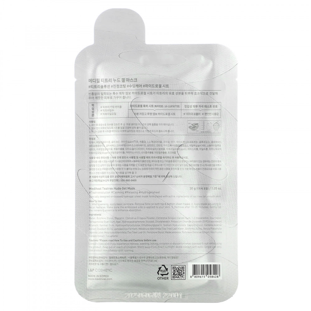 Специально разработанная тканевая маска из гидрогеля с тиснением содержит активные ингредиенты чайного дерева, которая разглаживает кожу.