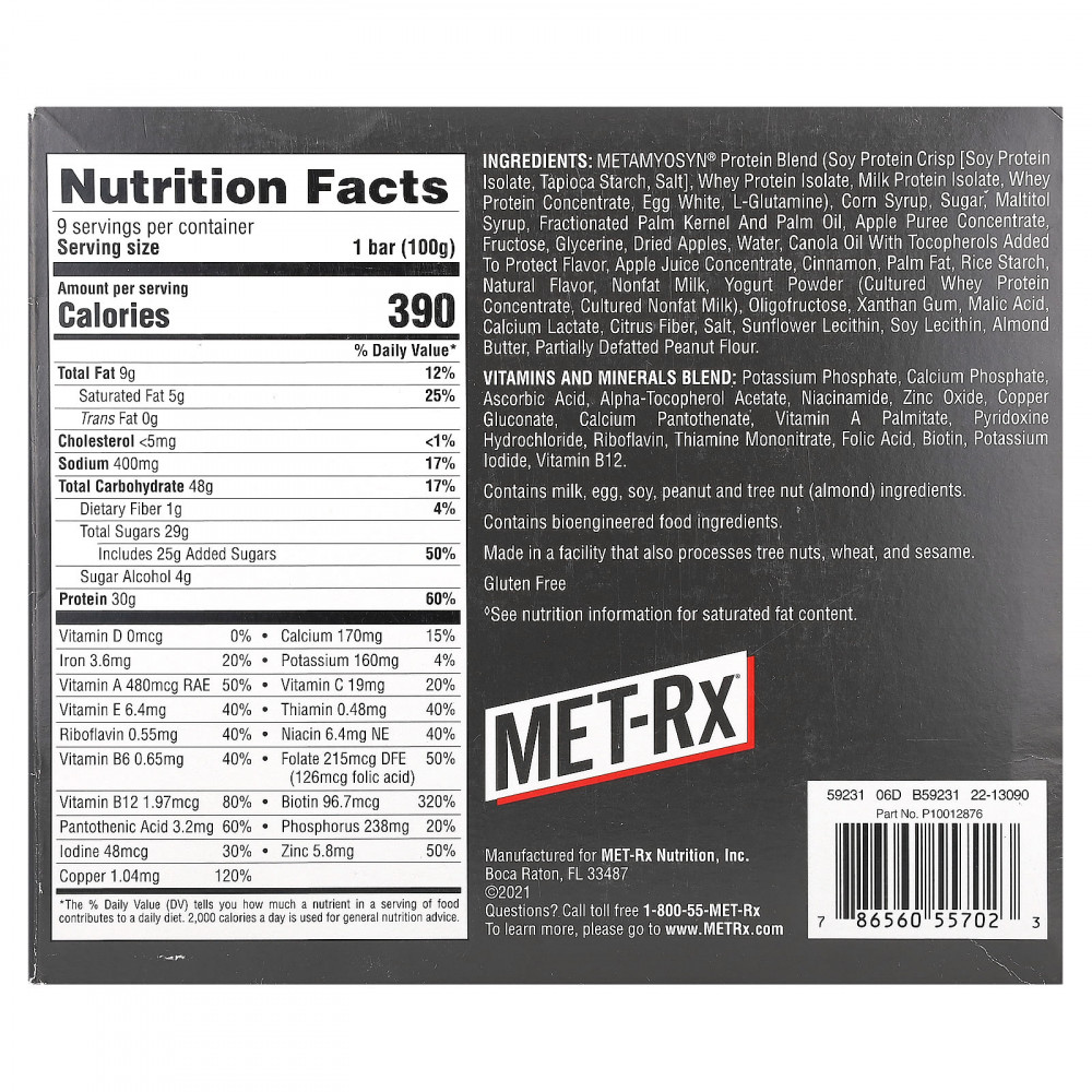 Протеиновая смесь Metamyosyn® (хрустящий соевый протеин [изолят соевого протеина, тапиоковый крахмал, соль], изолят сывороточного протеина, изолят молочного протеина, концентрат сывороточного протеина, яичный белок, l-глютамин), кукурузный сироп, сахара, мальтитный сироп, фракционированные ядра пальмы и пальмовое масло, концентрат яблочного пюре, фруктоза, глицерин, сушеные яблоки, вода, рапсовое масло с токоферолами для защиты вкуса, концентрат яблочного сока, корица, пальмовый жир, рисовый крахмал, натуральный ароматизатор, обезжиренное молоко, порошок из йогурта (концентрат культивированного сывороточного протеина, обезжиренное молоко), олигофруктоза, ксантановая камедь, яблочная кислота, лактат кальция, цитрусовая клетчатка, соль, подсолнечный лецитин, соевый лецитин, миндальное масло, частично обезжиренная арахисовая мука.