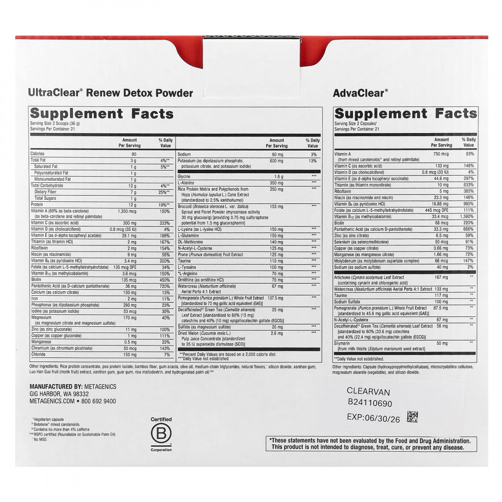 UltraClear® Renew Detox Powder предлагает улучшенную питательную поддержку на этапах детоксикации I, II и III, способствуя естественному ощелачиванию организма и метаболизму тяжелых металлов. С основой из 14,5 г OptiProtein®, 12 г веганского горохового / рисового протеина и 2,5 г аминокислот, он содержит ксантогумол в виде XNT ProMatrix®, порошок из ростков и цветков брокколи в виде Brassinase ™, а также экстракты чернослива и граната для здоровья клеток. Глицин и сульфат магния помогают в фазе детоксикации, наряду с N-ацетил-L-цистеином, катехинами зеленого чая и антиоксидантами, такими как бета-каротин, витамины C и E.