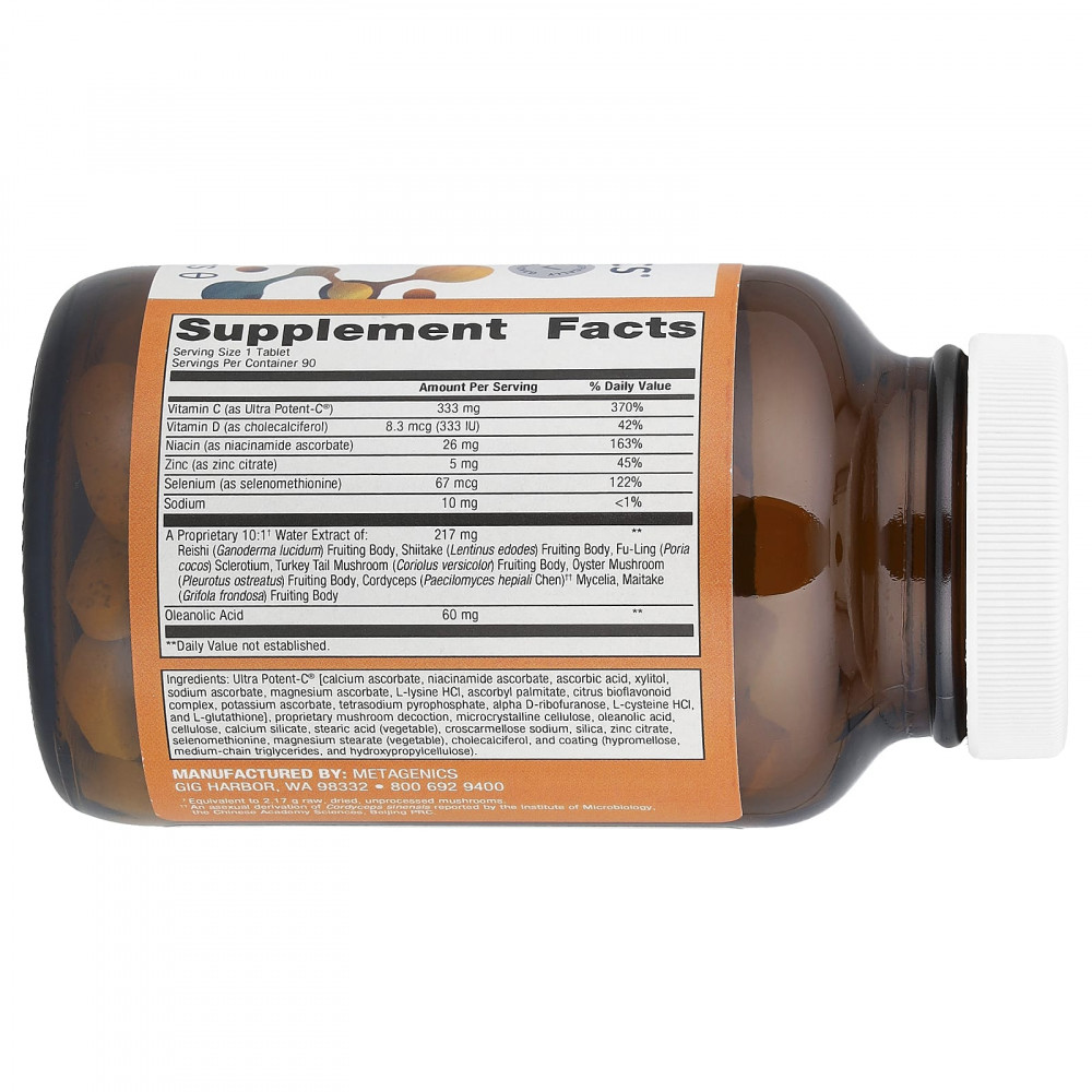Ultra potent-c® [аскорбат кальция, аскорбат ниацинамида, аскорбиновая кислота, ксилитол, аскорбат натрия, аскорбат магния, L-лизин HCI, аскорбил пальмитат, цитрусовый биофлавоноидный комплекс, аскорбат калия, тетранатрий пирофосфат, альфа-d-рибофураноза, L-цистеин HCI, и l-глутатион], запатентованный грибной отвар, микрокристаллическая целлюлоза, олеаноловая кислота, целлюлоза, силикат кальция, стеариновая кислота (растительная), кроскармеллоза натрия, диоксид кремния, цитрат цинка, селенометионин, стеарат магния (растительный), холекальциферол, и покрытие (гипромеллоза, среднецепочечные триглицериды, гидроксипропилцеллюлоза).