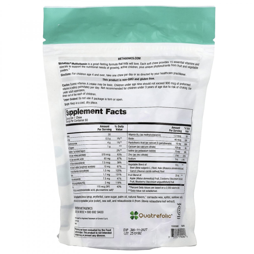 Мультивитамины MetaKids® - это средство с превосходным вкусом, которое понравится детям. Каждая жевательная таблетка содержит 15 незаменимых витаминов и минералов для удовлетворения потребностей в питательных веществах растущих и активных детей, а также уникальные фитонутриенты из порошков из фруктов и овощей.