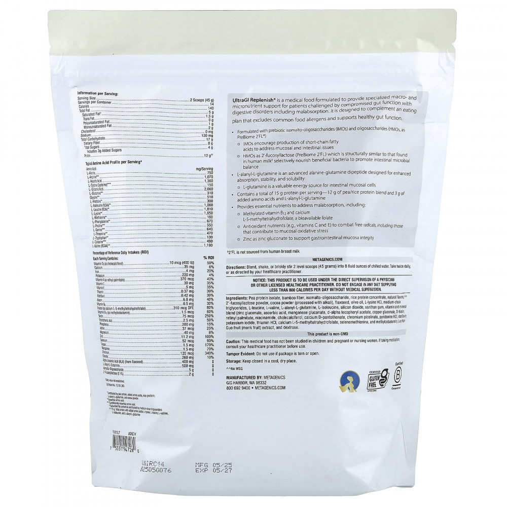 UltraGl Replenish® - это полезный пищевой продукт, разработанный для обеспечения специализированной поддержки макро- и микронутриентов пациентами с нарушенной функцией кишечника с расстройствами пищеварения, включая мальабсорбцию.Он разработан в качестве дополнения к плану питания, исключая распространенные пищевые аллергены и поддерживая здоровую работу кишечника.