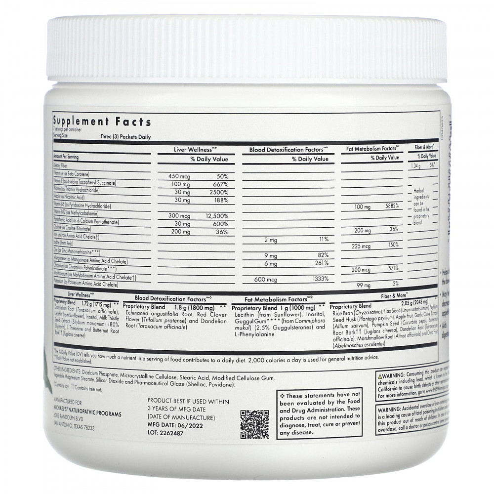 Принимать содержимое одного пакетика во время каждого приема пищи (3 пакетика в день). Следуйте этому графику в течение 7 дней. В течение всего времени использования программы Michael's® 1 Week Flush ™ пейте много воды (лучше всего не из-под крана). 8 стаканов и более в день. Также полезно увеличить потребление волокнистых фруктов и овощей, уменьшив при этом потребление обработанных пищевых продуктов, мяса и молочных продуктов.