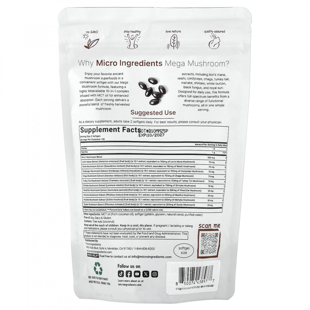 Наслаждайтесь любимыми суперфудами из древних грибов в удобной мягкой таблетке с нашей формулой Mega Mushroom, содержащей комплекс 10 в 1 с высокой биодоступностью, обогащенный маслом MCT для лучшего усвоения. Каждая порция содержит эффективную смесь свежесобранных грибов, экстрактов, включая ежовик гребенчатый, рейши, кордицепс, чагу, трутовик разноцветный, гриб-баран, шиитаке, ежовик гребенчатый, черный гриб и королевский гриб. Это средство, разработанное для ежедневного использования, предлагает полный спектр полезных свойств грибов в одной простой порции.