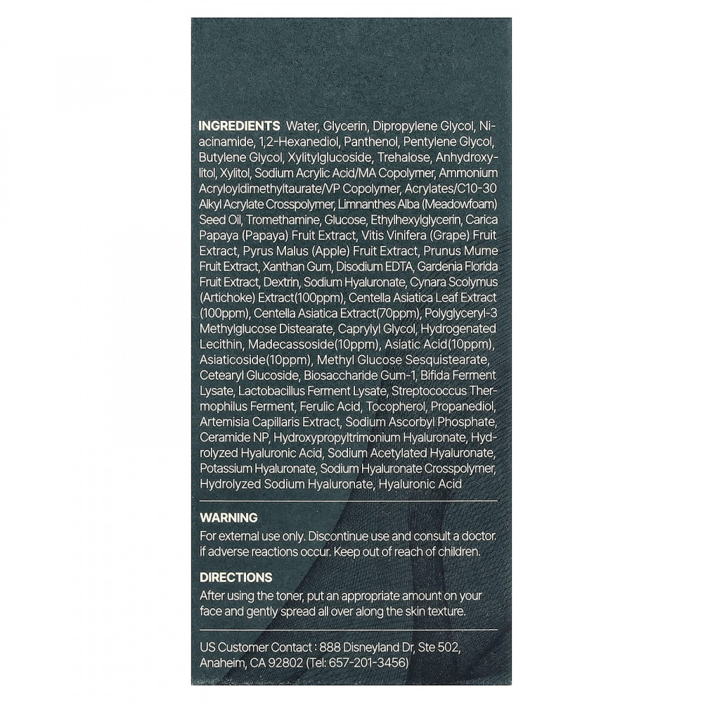 Вода, глицерин, дипропиленгликоль, никотинамид, 1,2-гександиол, пантенол, пентилен гликоль, бутиленгликоль, ксилитилглюкозид, трегалоза, ангидроксилитол, ксилитол, натрий акриловая кислота/МА сополимер, аммоний акрилоилдиметилтаурат/ВП сополимер, акрилат/c10-30 алкил акрилат кроссполимер, масло из семян пенника лугового (Limnanthes alba), трометамин, глюкоза, этилгексилглицерин, экстракт плодов папайи (Carica papaya), экстракт плодов винограда (Vitis vinifera), экстракт яблока (Pyrus malus), экстракт плодов японского абрикоса (Prunus mume), ксантановая камедь, двунатриевая ЭДТК, экстракт плодов гардении жасминовидной (Gardenia florida), декстрин, гиалуронат натрия, экстракт артишока (Cynara scolymus) (100 част./млн), экстракт листьев готу колы (Centella asiatica) (100 част./млн), экстракт готу колы (Centella asiatica) (70 част./млн), полиглицерил-3 метилглюкозы дистеарат, каприлилгликоль, гидрогенизированный лецитин, мадекассосид (10 част./млн), азиатиковая кислота (10 част./млн), азиатикозид (10 част./млн), метилглюкозы сесквистеарат, цетеариловый глюкозид, биосахаридная смола-1, лизат ферментов бифидобактерий, лизат продукта ферментации лактобактерий, фермент Streptococcus thermophilus, феруловая кислота, токоферол, пропандиол, экстракт полыни волосовидной (Artemisia capillaris), аскорбил фосфат натрия, керамид NP, гиалуронат гидроксипропилтримония, гидролизованная гиалуроновая кислота, ацетилированный гиалуронат натрия, гиалуронат калия, кроссполимер гиалуроната натрия, гидролизованный гиалуронат натрия, гиалуроновая кислота.