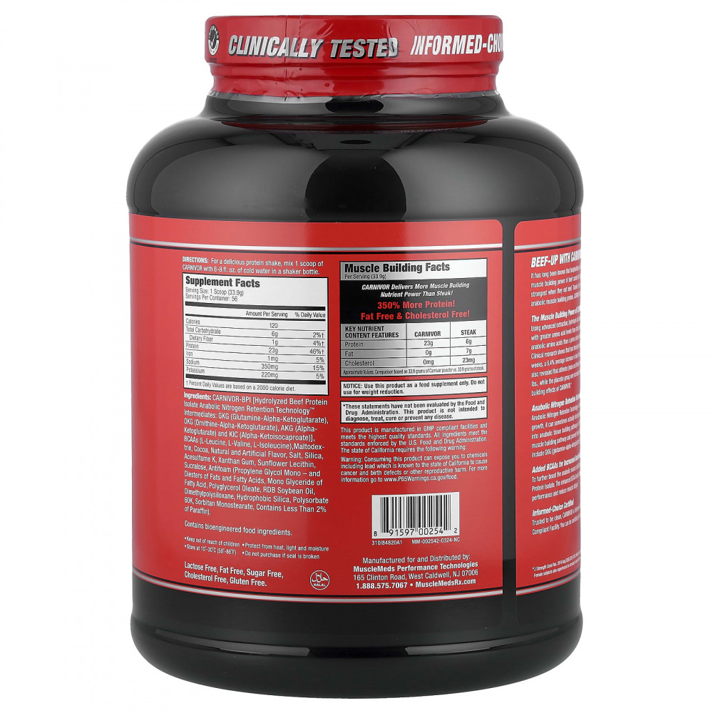 Давно известно, что бодибилдеры и силовые атлеты потребляют большое количество говядины для наращивания мышечной массы и увеличения силы. Польза говядины для наращивания мышечной массы неоспорима. Большинство бодибилдеров скажут вам, что самого большого роста мышечной массы и они чувствуют себя сильнее, употребляя говядину. Благодаря развитию усовершенствованного говяжьего протеина, полученного с помощью биоинженерии, компания MuscleMeds создала высокоанаболический протеин для наращивания мышечной массы. CARNIVOR не похож ни на одну другую существующую протеиновую добавку.