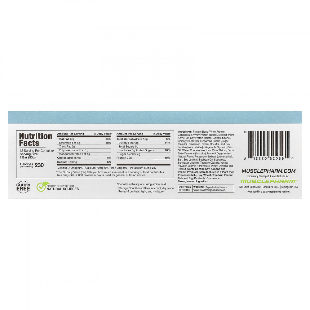 Протеиновая смесь (концентрат сывороточного протеина, изолят сывороточного протеина), мальтит, пальмоядровое масло, изолят соевого белка, желатин [бычий], клетчатка из корня цикория, корица (сахар, пальмовое масло, корица, обезжиренное сухое молоко, и соевый лецитин [эмульгатор]), растительный глицерин, пальмовое масло, вода. содержит менее 2% пищевой соды, бета-каротин (краситель), моно- и диглицериды, натуральный ароматизатор, сорбат калия (консервант), соль, соевый лецитин, соевое масло, сукралоза, подсолнечный лецитин, диоксид титана, ванильный порошок, витамин A (пальмитат), сыворотка, миндаль и арахис.