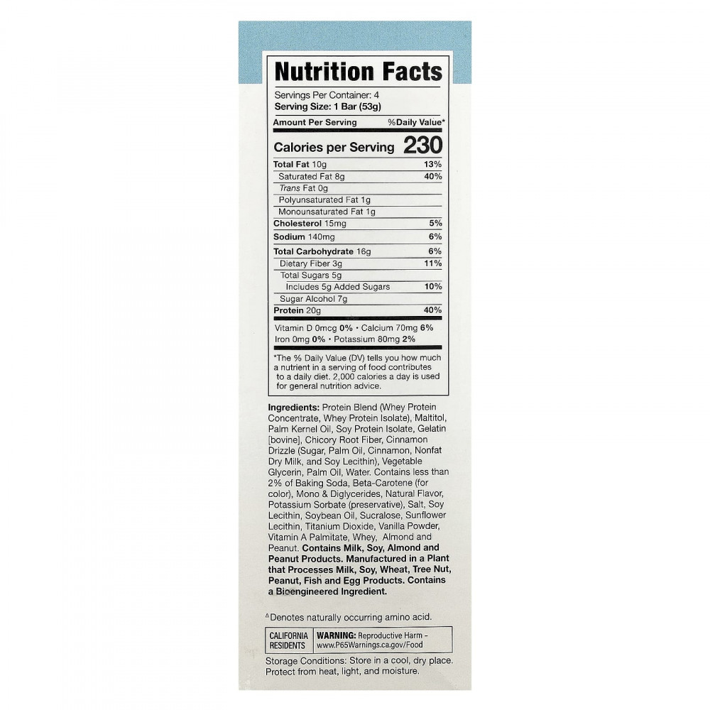 Протеиновая смесь (концентрат сывороточного протеина, изолят сывороточного протеина), мальтит, пальмоядровое масло, изолят соевого белка, желатин [бычий], клетчатка из корня цикория, корица (сахар, пальмовое масло, корица, обезжиренное сухое молоко, и соевый лецитин), растительный глицерин, пальмовое масло, вода. содержит менее 2% пищевой соды, бета-каротин (краситель), моно- и диглицериды, натуральный ароматизатор, сорбат калия (консервант), соль, соевый лецитин, соевое масло, сукралоза, подсолнечный лецитин, диоксид титана, ванильный порошок, витамин A (пальмитат), сыворотка, миндаль и арахис.